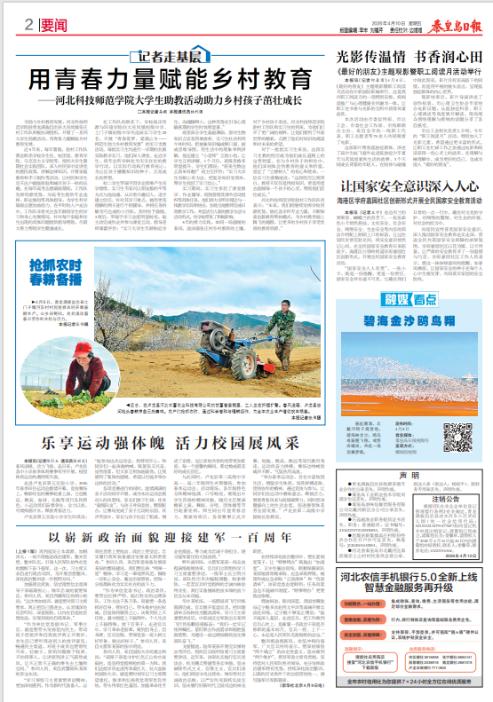 2026年4月10日,《秦皇岛日报》要闻版以“用青春力量赋能乡村教育——河北科技师范学院大学生助教活动助力乡村孩子茁壮成长”为题,对河北科技师范学院驻青龙满族自治县大巫岚镇张庄村工作队组织开展大学生助教活动进行了宣传报道。我院共选派实习生25名,在杜利强老师组织下开展“青春筑梦,爱满山乡”的实习支教活动。同学们深入课堂、走近学生,将专业所学转化为教学活动,为山区孩子播撒知识的种子、点亮成长的梦想。
