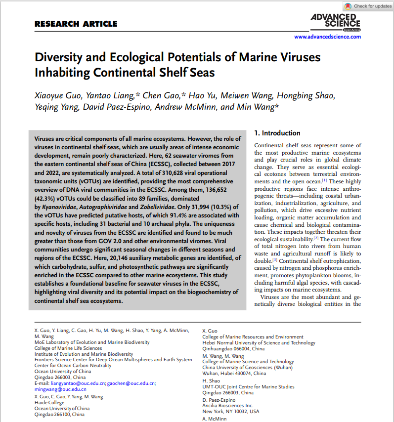 近日,海洋资源与环境学院郭晓月博士在陆架海病毒研究领域斩获重要突破,其学术成果《Diversity and Ecological Potentials of Marine Viruses Inhabiting Continental Shelf Seas》(《陆架海海洋病毒的多样性及生态潜力》),发表在国际知名学术期刊Advanced Science(《先进科学》),我校作为署名单位。该期刊作为中科院1区Top期刊,五年影响因子(IF5-year)达14.3的高水平,是全球行业内公认的高影响力权威学术平台。